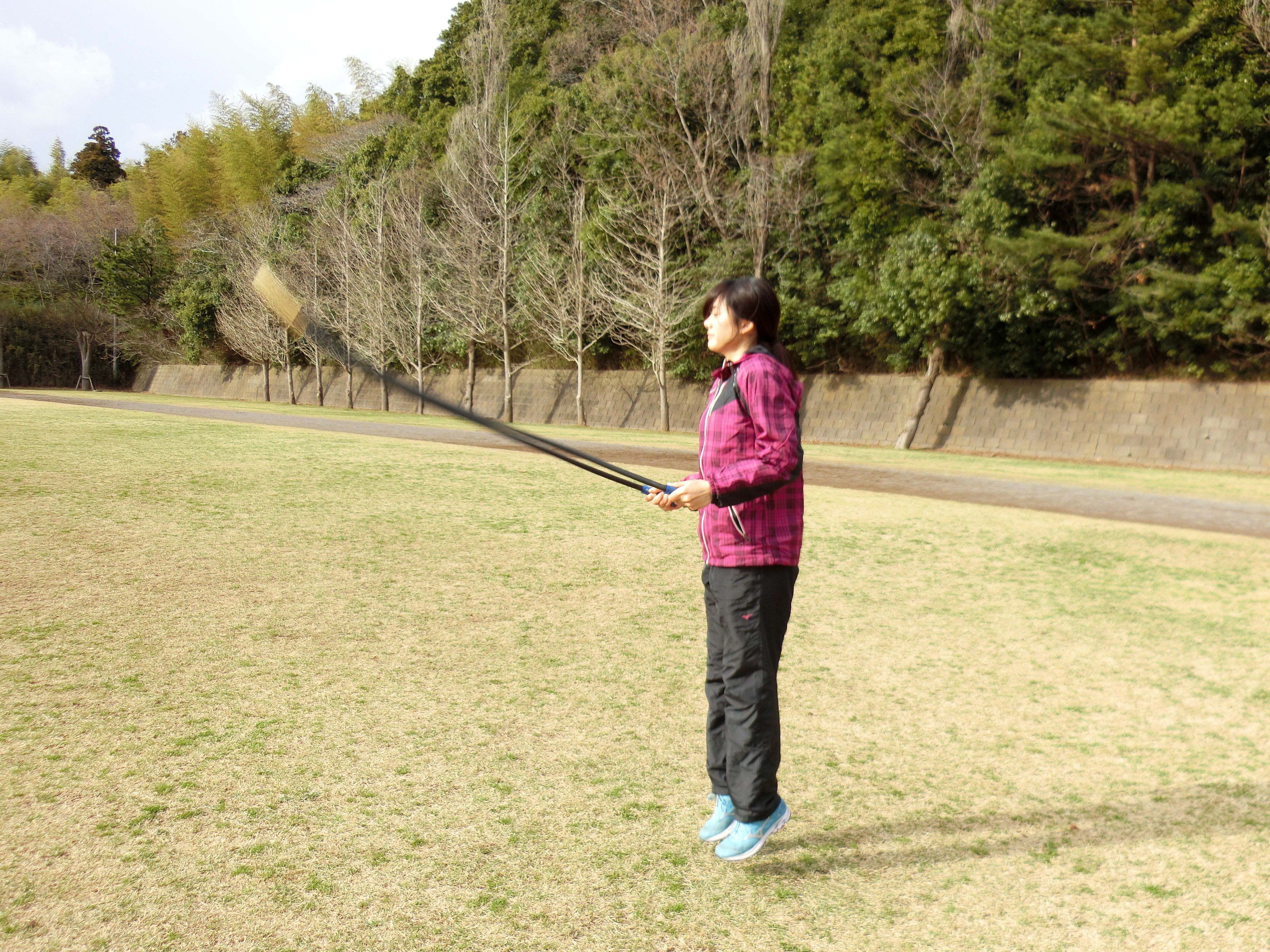 1kg+遠心力により前にロープが行った時には背筋力が、後ろに行った時には腹筋力などバランス能力と体幹強化につながります。